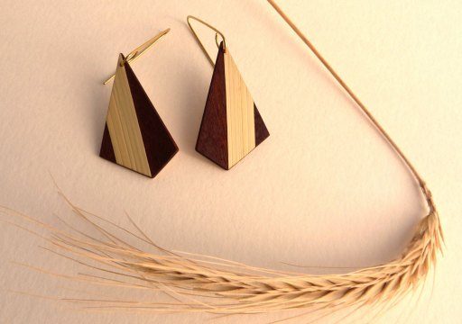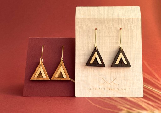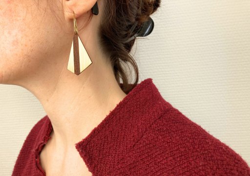 Toujours chercher à être en harmonie entre les formes des attaches en fil de laiton pour les oreilles et les formes des pièces en bois qui forment les bijoux en paille.